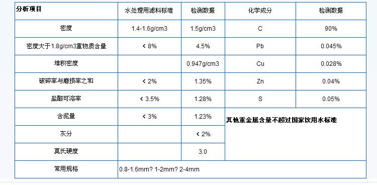 無煙煤濾料在水處理中起的作用好壞,直接影響濾過的水質(zhì),所以在選擇無煙煤濾料的時(shí)候,質(zhì)量必須符合國(guó)家相關(guān)標(biāo)準(zhǔn)。下為建設(shè)部水處理濾料監(jiān)督檢測(cè)中心頒布的CJ/T43 -2005《水處理用濾料》中無煙煤濾料的相關(guān)標(biāo)準(zhǔn)。